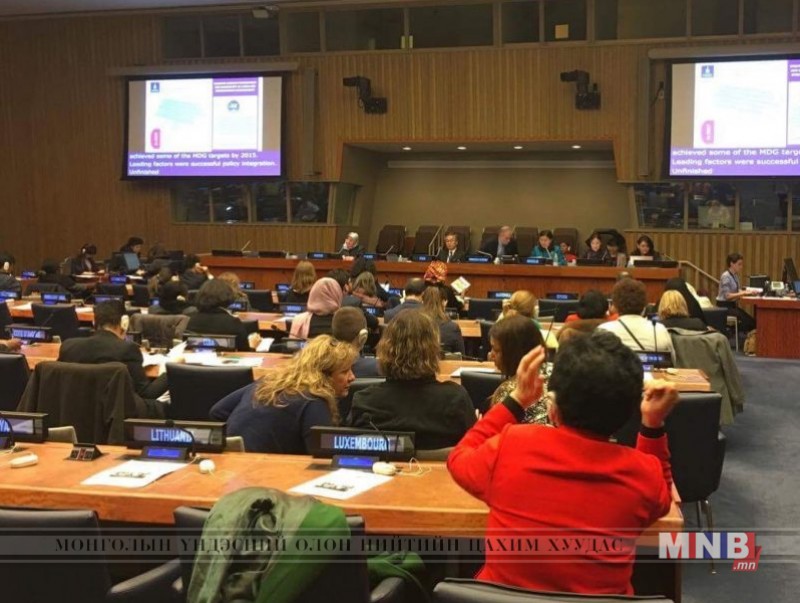 Нью-Йорк хотноо болсон НҮБ-ын Эдийн засаг, нийгмийн зөвлөлийн Эмэгтэйчүүдийн аж байдлын комисс (ЭАБК)-ын 61 дүгээр чуулганд оролцож буй Монгол Улсын Засгийн газрын төлөөлөгчид “Охид, эмэгтэйчүүдийн асуудлаарх Мянганы хөгжлийн зорилтуудын хэрэгжилт, сорилт бэрхшээлүүд” сэдвээр сайн дурын илтгэлээ гуравдугаар сарын 17-нд танилцуулав.