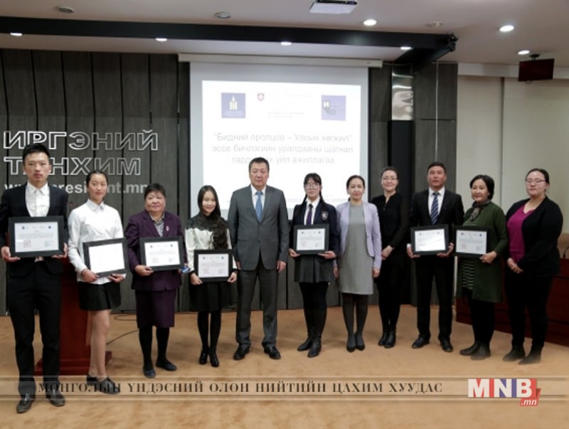 Монгол Улсын Ерөнхийлөгчийн Тамгын газар, Швейцарийн хөгжлийн агентлагийн хамтран хэрэгжүүлж буй “Иргэдийн оролцоо” төслөөс зарласан “Бидний оролцоо – Улсын хөгжил” эссе бичлэгийн уралдааны шагнал гардуулах үйл ажиллагаа өнөөдөр Ерөнхийлөгчийн дэргэдэх Иргэний танхимд боллоо.