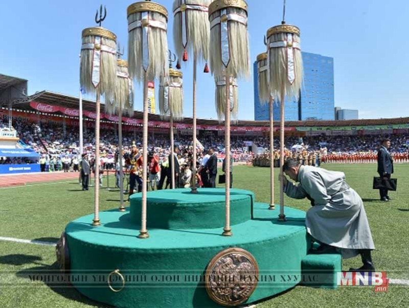 Төрийн тэргүүн Төв цэнгэлдэх хүрээлэнгийн зүлэг ногоон дэвжээний төвд залсан Төрийн есөн хөлт их цагаан тугийг нар зөв тойрсны дараа туганд мэхийн ёсолж хүндэтгэв.