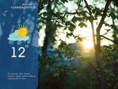 2017 оны 08-р сарын 11-ний 12-18 цаг хүртэлх цаг агаарын мэдээ: Үүлэрхэг. Бага зэргийн бороо орно. Дуу цахилгаантай. Салхи зүүн хойноос секундэд 4-9 метр, түр зуур секундэд 12-14 метр хүрч ширүүснэ. 14-16 хэм дулаан байна.