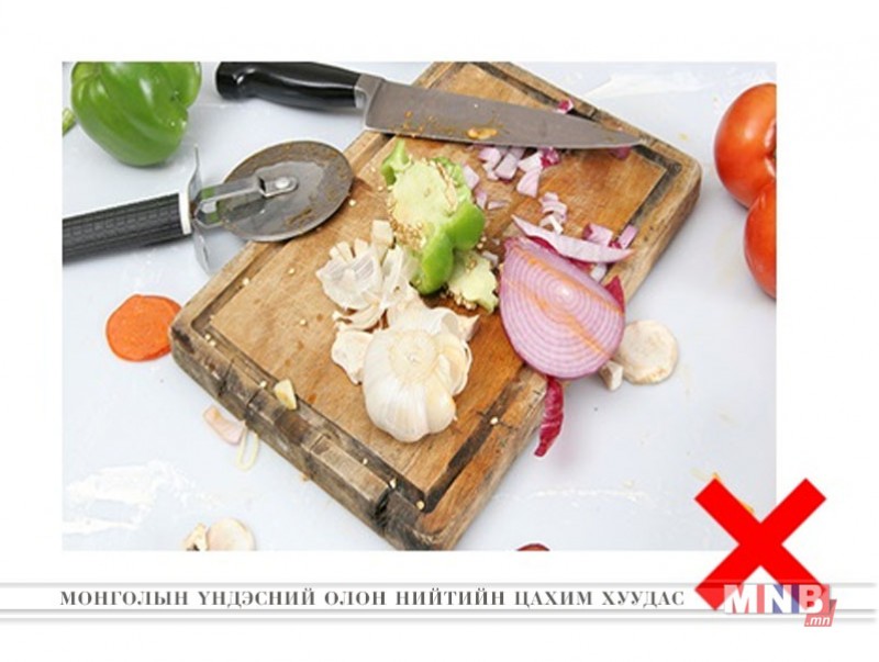2. Тусгаарлах: Түүхий болон болсон хоол хүнсийг тус тусын ганпанз дээр бэлтгэх шаардлагатай. Учир нь түүхий мах хэрчиж, бэлтгэсэн ганпанз нь төрөл бүрийн мал амьтны маханд агуулагдах нянгаар бохирддог тул болсон, шууд идэх хүнсийг бохирдуулах эрсдэлтэй. Хоолны хордлого үүсгэх нэг том шалтгаан нь махны ганпанз дээр төрөл бүрийн зууш бэлтгэсэнээс болсон байдаг. Иймд болсон, түүхий хүнсэнд тус тусын ганпанз байх нь зүйтэй.