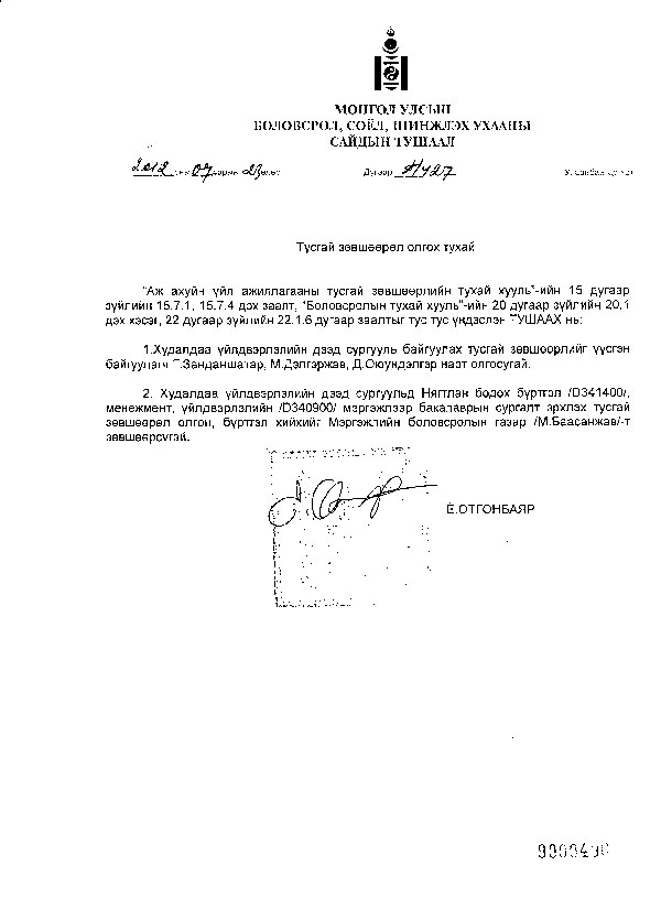Их, дээд сургуулийн тоо хэт олширсон байна хэмээн Засгийн газраар 15-р тогтоол гаргуулаад байсан БСШУ-ны сайд маань харин ар хударгаар нь шал өөр зүйл хийж байсан байх юм. Тэрээр 2012 оны долдугаар сарын 23-ны өдөр А/427 тоот тушаал гаргажээ. Хамгийн сонирхолтой нь энэхүү тушаалд “Худалдаа үйлдвэрлэлийн дээд сургууль байгуулах тусгай зөвшөөрлийг үүсгэн байгуулагч Г.Занданшатар, М.Дэлгэржав, М.Оюундэлгэр нарт олгосугай. Худалдаа үйлдвэрлэлийн дээд сургуульд нягтлан бодох, менежмент, үйлдвэрлэлийн мэргэжлээр баклаварын сургалт эрхлэх тусгай зөвшөөрөл олгон бүртгэл хийхийг Мэргэжлийн боловсролын газарт зөвшөөрсүгэй” хэмээн бичээд гарын үсгээ зурж, БСШУЯ-ны тамгыг дарсан байх юм.