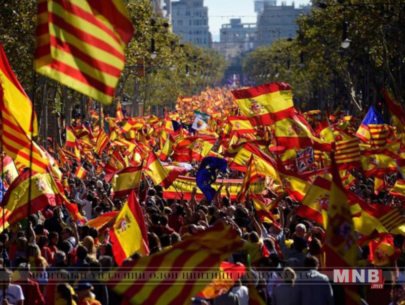 Тусгаар тогтнолоо зарлаж, автономит эрхээ хасуулсан Каталон мужид Испанийн эв нэгдлийн төлөөх жагсаал цуглаан болсон байна. Жагсагчдын зарим нь Испанийн төв Засгийн газрын шийдвэрээр албан үүргээсээ огцроод байгаа Каталоны тэргүүн асан Пучдемоныг баривчилж хорихыг уриалж байжээ.