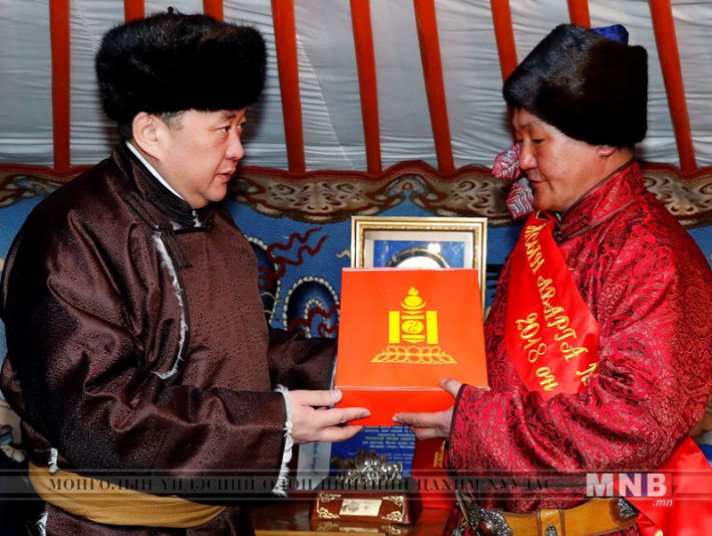 Монгол Улсын Их Хурлын дарга М.Энхболд Төв аймгийн Баян сумын малчин Э.Содномжамц, Ц.Ганхүү, Баянжаргалан сумын малчин Р.Мөнхдорж нарт “Монгол Улсын аварга малчин”-ы шагналыг нь өчигдөр гардуулж өглөө.