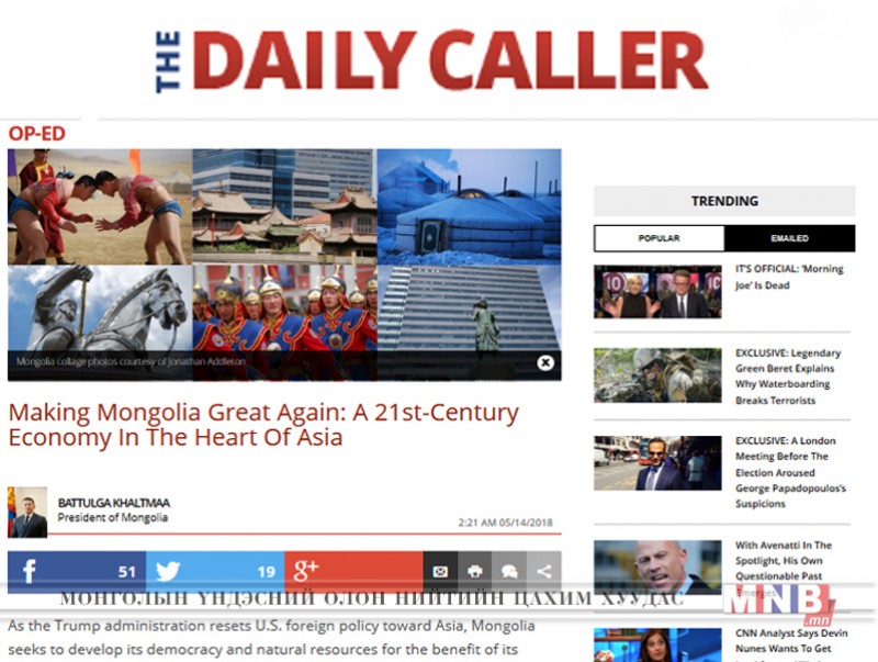 АНУ-ын Вашингтон хотод редакцтай www.dailycaller.com мэдээллийн сайтад “Монголын загвар” нэртэй нийтлэл нийтлэгджээ. АНУ болон Монгол Улсын худалдааны асуудлыг хөндсөн энэхүү нийтлэлийг англи хэлээр тухайн мэдээллийн сайтаас уншихыг хүсвэл ЭНД дарна уу.