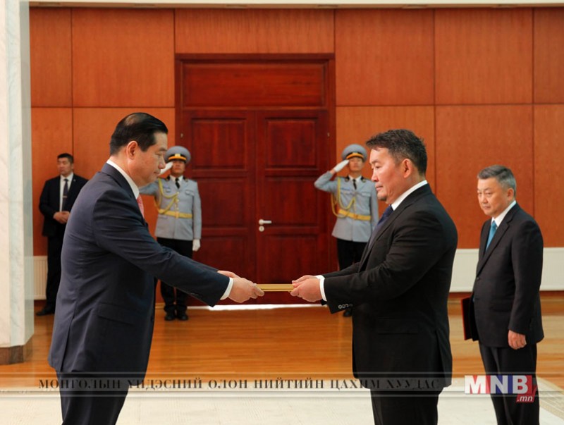 | Элчин сайд Жон Жэ Нам Ерөнхийлөгч Х.Баттулгад Итгэмжлэх жуух бичгээ өргөн барилаа | ||