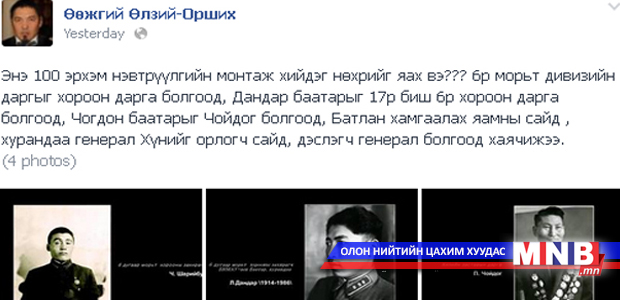 Олон нийтийн цахим хуудсыг идэвхитэй ашиглаж өөрийнхөө амбицийг өсгөж байдаг эрхэм бол яахын аргагүй гитарчин Д.Өлзий-Орших буюу Өөжгий. Тэрээр саяхан өөрийн фэйсбүүк хуудсандаа “Монгол тулгатны 100 эрхэм” нэвтрүүлгийн талаар бичсэн байна. “Монгол тулгатны 100 эрхэм” нэвтрүүлэг түүний ажигч гярхай нүднээс өнгөрсөнгүй. Тус нэвтрүүлгийн эвлүүлэгч нь хэд хэдэн алдаа гаргасныг нь мань эр олоод харчихаж. Тэрбээр үүнийгээ “Энэ 100 эрхэм нэвтрүүлгийн монтаж хийдэг нөхрийг яах вэ??? 6-р морьт дивизийн даргыг хороон дарга болгоод, Дандар баатрыг 17 биш 6-р хороон дарга болгоод, Чогдон баатрыг Чойдог болгоод, Батлан хамгаалах яамны сайд , хурандаа генерал хүнийг орлогч сайд, дэслэгч генерал болгоод хаячижээ” гэж бичээд зургийг нь оруулсан байна.