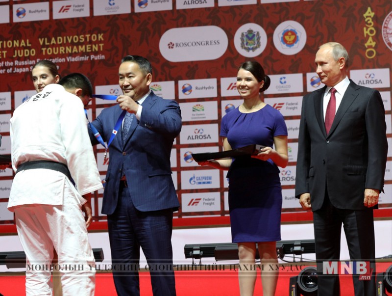 Монгол Улсын Ерөнхийлөгч Х.Баттулга ОХУ-ын Ерөнхийлөгч Владимир Путин, Японы Ерөнхий сайд Шинзо Абэ нарын хамтаар Дорнын эдийн засгийн IV чуулганы хоёр дахь өдөр болсон Өсвөрийн жүдо бөхийн тэмцээний финалын барилдаануудыг үзэж сонирхон, медальт байранд шалгарсан тамирчдын шагналыг гардуулав.