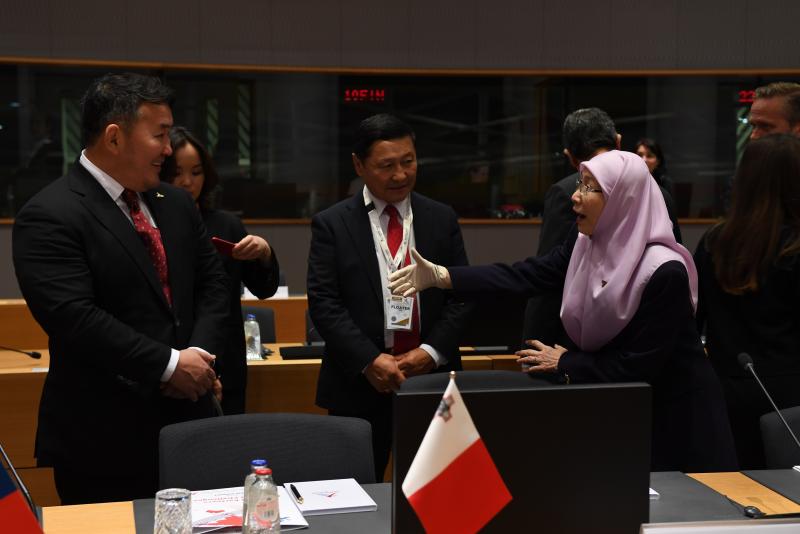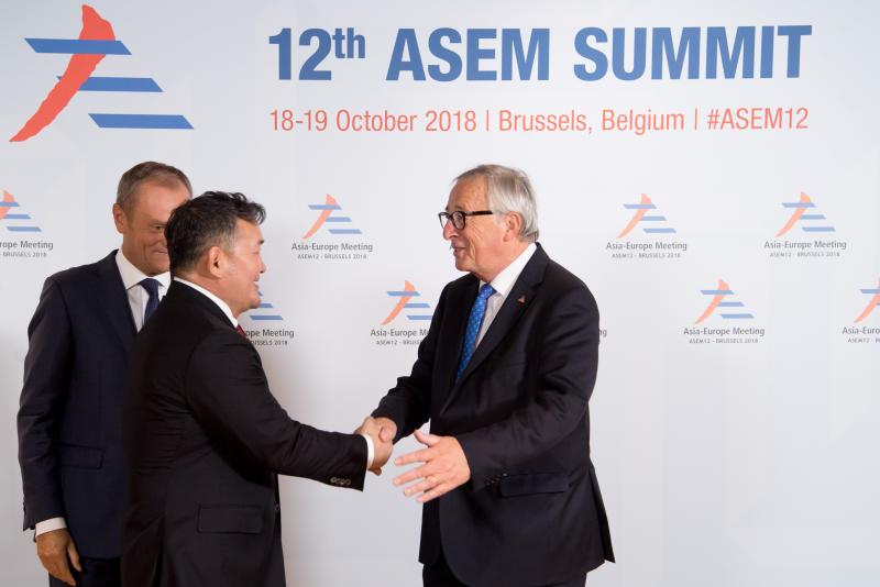 Бельги улсын Брюссель хотноо болж буй Ази-Европын дээд хэмжээний 12 дугаар уулзалт өчигдөр буюу 10 дугаар сарын 18-нд албан ёсоор эхлэв. Дээд хэмжээний уулзалтад оролцож буй Монгол Улсын Ерөнхийлөгч Х.Баттулгыг Европын Зөвлөлийн байранд хүрэлцэн ирмэгц Европын Зөвлөлийн дарга Дональд Туск, Европын Комиссын ерөнхийлөгч Жан-Клод Юнкер нар угтан мэндчилж, АСЕМ-ын уулзалтад амжилт хүсэв.