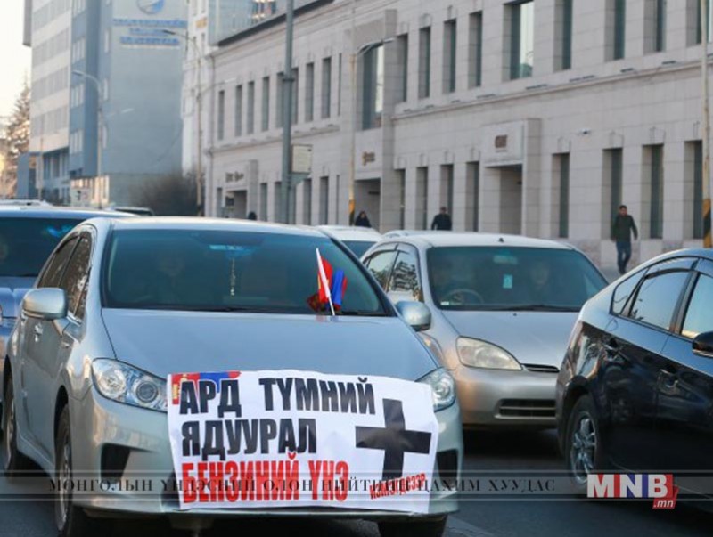 “Засгийн газар шатахууны үнийг 1500 төгрөгт тогтоон барих ёстой. Чадахгүй бол огцор” гэсэн лоозон барьсан хэсэг хүн Сүхбаатарын талбайг машины цуваагаар тойрч, эсэргүүцлээ илэрхийлж байна.