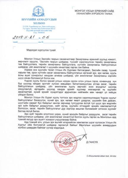 Ард түмний элч, улсын эрх ашгийг илэрхийлэн хамгаалах үүрэг хүлээсэн Улсын Их Хурлыг ийм болчимгүй шийдвэр гаргахгүй байхыг Шүүхийн ахмадуудын холбоо шаардаж байгааг үүгээр мэдэгдье" гэжээ.