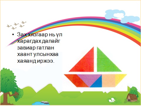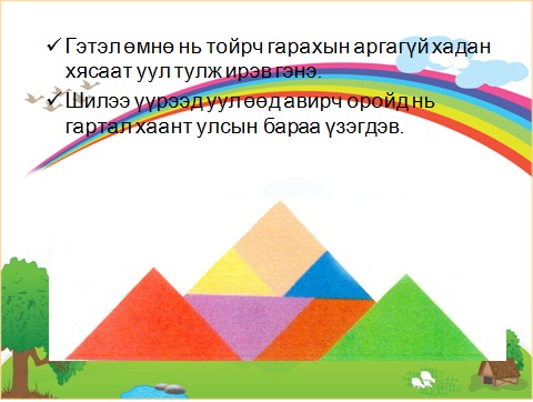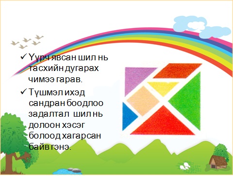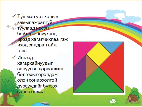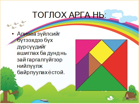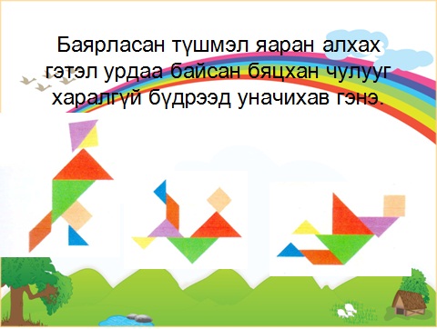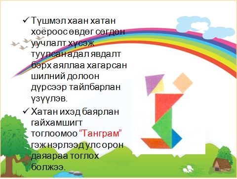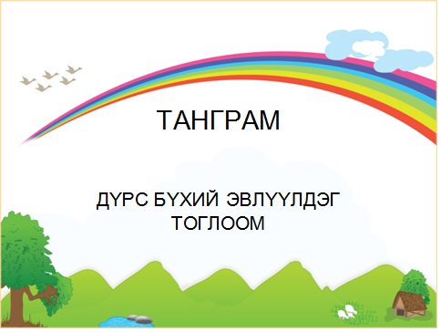 Танграм гэх уг тоглоом нь долоон өнгийн модыг эвлүүлж тоглодог эртний Хятадын тоглоом юм. Энэ толоомоор хүүхэд өөрийн мэддэг эд зүйл, амьтны дүрсийг эвлүүлэн тоглох боломжтой бөгөөд хүүхдүүдийн сэтгэхүй, төсөөлөн бодох чадварыг хөгжүүлдэг.