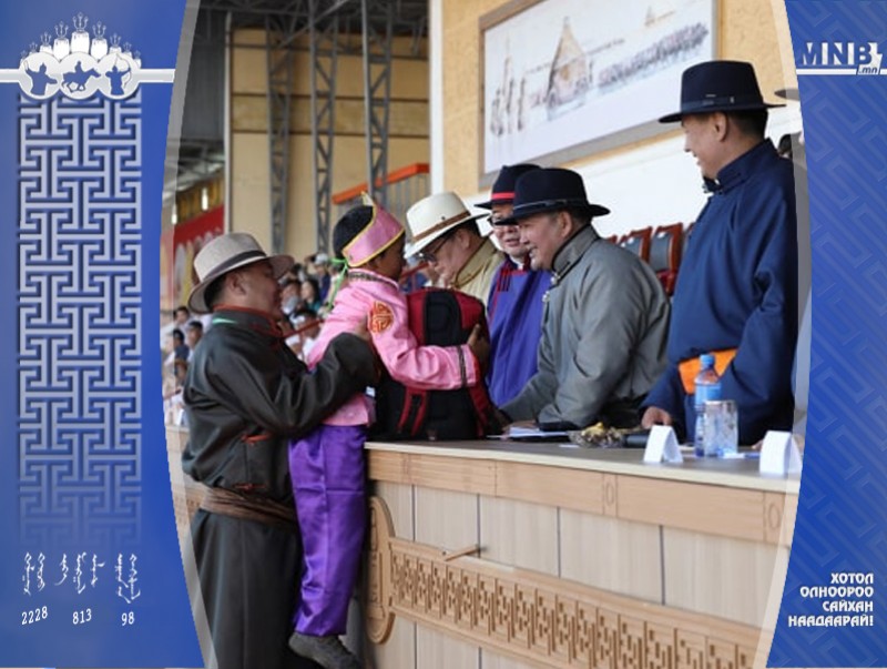 Монгол Улсын Ерөнхийлөгч Х.Баттулга Тулгар төрийн 2228, Их Монгол Улсын 813, Ардын хувьсгалын 98 жилийн ой, Үндэсний их баяр наадмаар азарга, их нас, соёолон, хязаалан, шүдлэн, даага насны хурдан морины уралдаанд унасан хүлгээ түрүү магнай, аман хүзүүнд уралдуулж, айрагдуулсан унаач хүүхдүүдэд гарын бэлгээ гардууллаа.