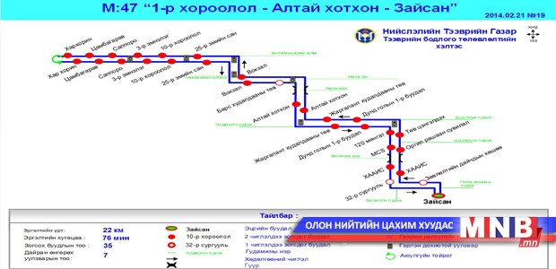 Нийслэлийн тээврийн газраас “1 дүгээр хороолол-Алтай хотхон-Зайсан” чиглэлийн үндсэн М:47 шугамыг өнгөрсөн долоо хоногоос эхлэн шинээр нээжээ. Баянгол дүүргийн нэг, гуравдугаар хорооны нутагт харьяалагдах Дунд гол, Алтай хотхоны иргэдийн хүсэлтээр нийтийн тээврээр зорчин явах эрэлтийг үндэслэн энэхүү шугамыг нээсэн байна. Шинэ чиглэлд “Атибус” ХХК найман автобусаар үйлчилгээ үзүүлж байгаа ажээ.