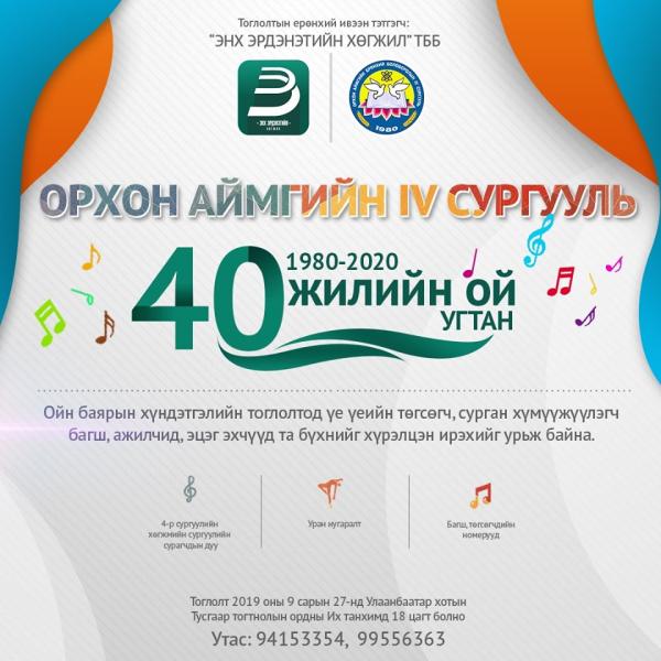 Орхон аймгийн IV сургуулийн 40 жилийн ойн баярын хүндэтгэлийн тоглолтод тус сургуулийн хөгжмийн сургуулийн сурагчид дуу хөгжим, бүжиг, уран нугаралтын үзүүлбэр үзүүлэхээс гадна багш нар болон үе үеийн төгсөгчид оролцох аж.