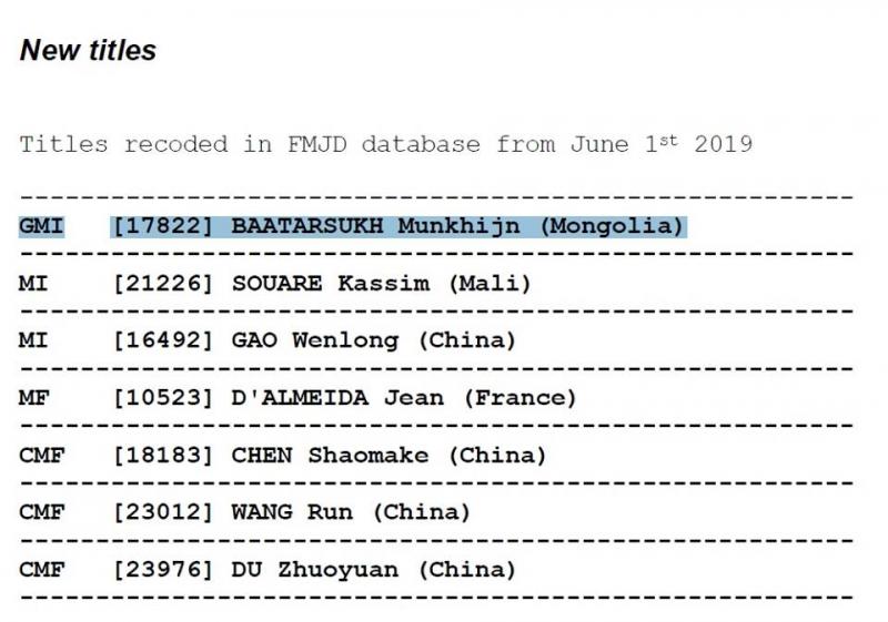 Түүнчлэн Дэлхийн даамын холбооноос Ази тивийн насанд хүрэгчдийн аварга Б.Мөнхжин, Б.Мишээл нарт их мастер (International Grandmaster) цолыг албан ёсоор олгосон байна. Мөн Азийн АШТ-д амжилттай тоглосон Н.Лхагвадолгор, Б.Сэлэнгэ, У.Баяржаргал нар Дэлхийн даамын холбооны дэд мастер болж, олон улсын цолтнуудын тоог нэмлээ. Үүнээс гадна US Open 2019 тэмцээнээс Б.Мишээл эрэгтэйчүүдийн ДДХМ цолны нэг балл, Hingqui Cup тэмцээнээс С.Мөнх-Оргил, Г.Хэрлэнмөрөн нар эрэгтэйчүүдийн ДДХМ цолны нэг баллыг биелүүлсэн байна.