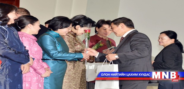 УИХ-ын эмэгтэй гишүүд, яамдын эмэгтэй сайд нар болон гүйцэтгэх, шүүх засаглалын байгууллагуудад удирдах алба хашиж буй бүсгүйчүүдийн төр, түмний төлөө зүтгэж буй үйлсэд өндөр амжилт хүсээд гарын бэлэг гардуулжээ.