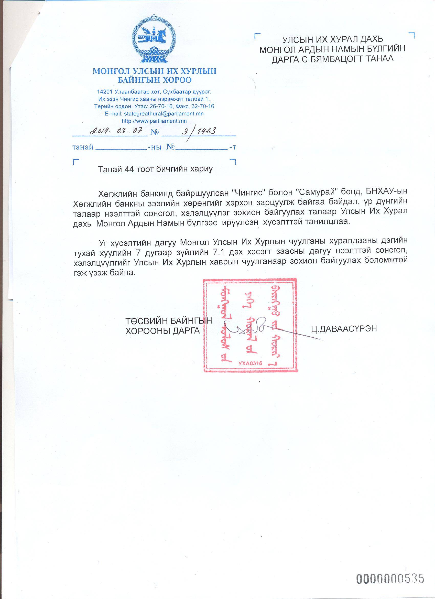 УИХ дахь МАН-ын бүлгийн хүсэлтийн дагуу УИХ-ын Төсвийн байнгын хорооны дарга Ц.Даваасүрэн бондуудын зарцуулалт, үр дүнгийн талаар нээлттэй сонсгол, хэлэлцүүлэг зохион байгуулах боломжтой гэж үзэж байгаагаа илэрхийлж албан бичиг илгээжээ. Ирэх хаврын чуулганаар зохион байгуулах энэхүү нээлттэй сонсголоор Хөгжлийн банкинд байршуулсан "Чингис" болон "Самурай" бонд, БНХАУ-ын Хөгжлийн банкны зээлийн хөрөнгийг хэрхэн зарцуулж байгаа байдал, үр дүнгийн талаарх мэдээллийг сонсох юм байна.