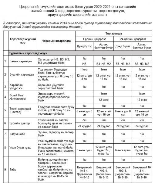 Боловсрол, шинжлэх ухааны сайдын 2020 оны “Цэцэрлэг, сургуулийн хичээл эхлүүлэх, бэлтгэл хангах, зохицуулалт хийх зарим арга хэмжээний тухай” А/17 дугаар тушаалын 2.4 дэх заалтад “Цэцэрлэгийн хүүхдийн эцэг эх, асран хамгаалагчаас хичээлийн жилд бэлтгэх сургалтын хэрэглэгдэхүүн, ариун цэврийн хэрэгслийг тэдэнд санхүүгийн дарамт үүсгэхгүйгээр авах зохицуулалт хийх” тухай заасан. Уг тушаалыг хэрэгжүүлэх зорилгоор цэцэрлэгийн хүүхдийн эцэг эхээс бэлтгүүлэн 2020-2021 оны хичээлийн жилийн эхний гурван сард хэрэглэх сургалтын хэрэглэгдэхүүн, ариун цэврийн хэрэгслийн жагсаалтыг баталжээ. аж.