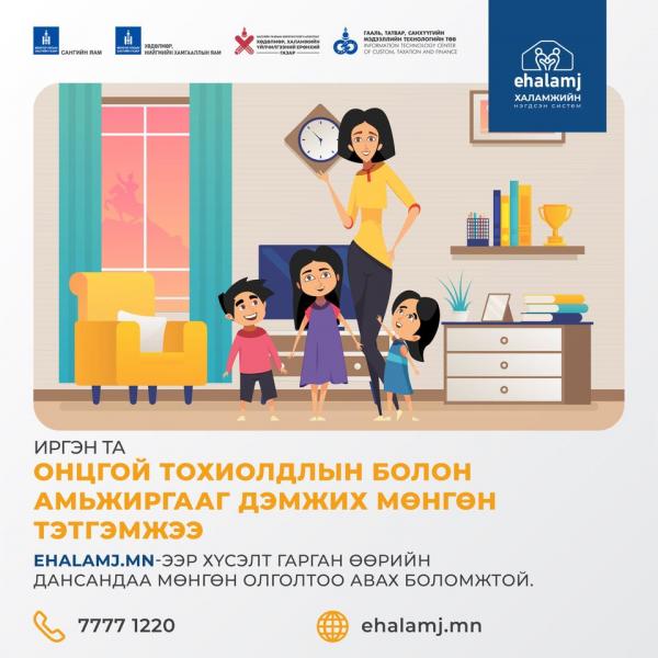 Засгийн газраас баримталж буй бодлого, төрийн үйлчилгээг түргэн шуурхай, чирэгдэлгүй байлгах зорилтын хүрээнд нийгмийн халамжийн үйлчилгээг цахимжуулж байгаа. Энэ хүрээнд “Цалинтай ээж”-ээс гадна жирэмсэн эхийн, 0-18 хүртэлх насны гурав болон түүнээс дээш хүүхэдтэй өрх толгойлсон эх, эцгийн, ихэр хүүхдийн тэтгэмж, Алдарт эхийн одонгийн болон “Насны хишиг”-ийн мөнгө авах хүсэлтээ www.ehalamj.mn сайтаар буюу цахимаар гаргах боломжтой. Мөн гар утасны “ebarimt” аппликэйшнийг ашиглан хүсэлт гаргаж, өөрийн дансаа холбож болно. Түүнчлэн интернэт ашиглах, цахим үйлчилгээ авах боломжгүй иргэд өөрийн сум, хорооныхоо халамжийн мэргэжилтэнд хандан хүсэлтээ цахимаар хүргүүлэх боломжтой болжээ.