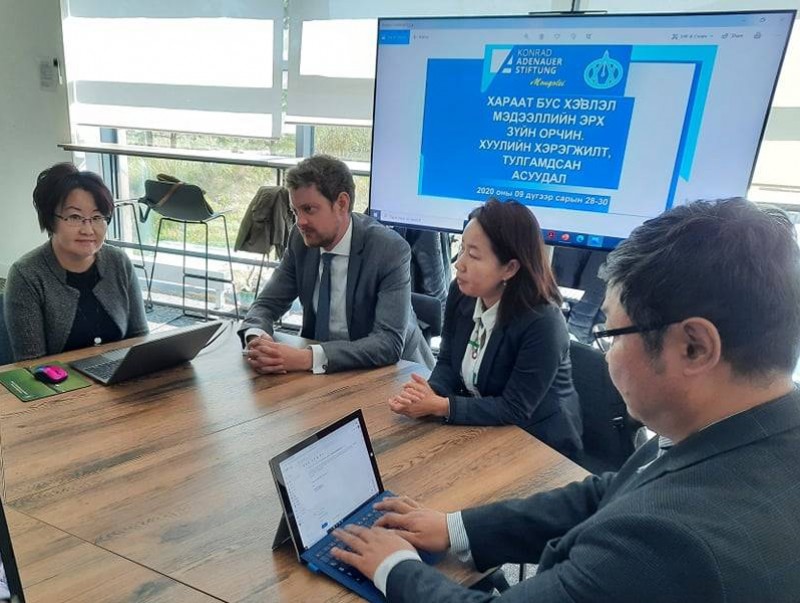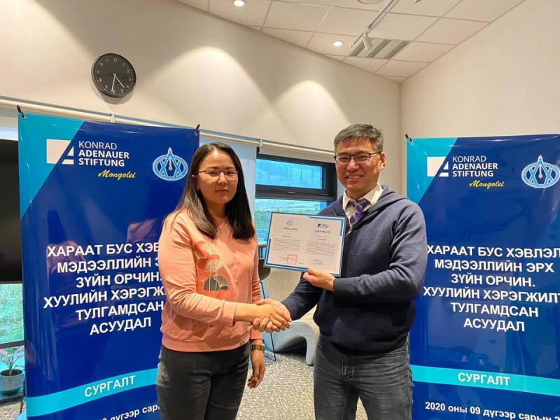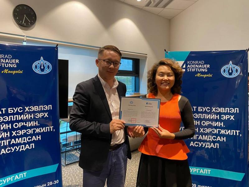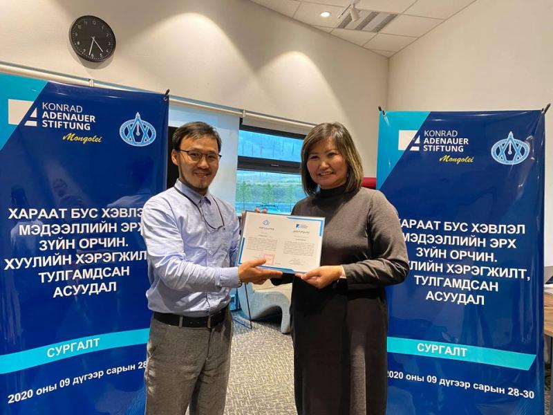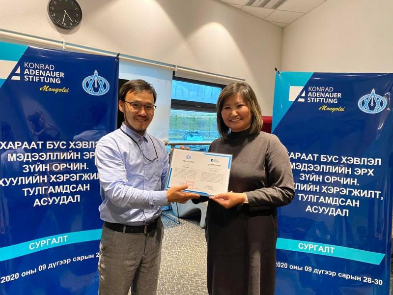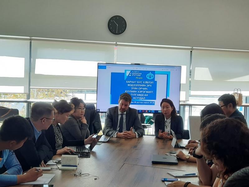 Хэвлэлийн хүрээлэн, Конрад Аденауэр сан хамтран “Хараат бус хэвлэл мэдээллийн эрх зүйн орчин” сэдэвт гурав хоногийн сургалтыг есдүгээр сарын 28-30-нд амжилттай зохион байгууллаа. Орчин цагийн хэвлэл мэдээллийн салбарт тулгамдсан эрх зүйн асуудлын талаар цогц мэдлэг, ойлголт олгох зорилготой тус сургалт “Үг хэлэх, үзэл бодлоо илэрхийлэх эрх чөлөө ба гүтгэлэг, доромжлол”, “Хараат бус хэвлэл мэдээллийн эрх зүйн зохицуулалт”, “Мэдээлэл авах эрх чөлөө, ил тод байдал” гэсэн үндсэн гурван сэдвийн дор болж, Хэвлэлийн Хүрээлэнгийн гүйцэтгэх захирал М.Мөнхмандах, Хууль зүйн үндэсний хүрээлэнгийн эрдэмтэн, нарийн бичгийн дарга П.Амаржаргал, Криминологичдын холбооны ТУЗ-ийн дарга, Хууль зүйн ухааны доктор, дэд профессор Б.Батзориг, "Ил тод сан" ТББ-ын тэргүүн Д.Цэрэнжав, МУИС-ийн багш Д.Бадамдаш, Хэвлэлийн хүрээлэнгийн багш Р.Оюунцэцэг, Т.Есөн-Эрдэнэ, Б.Мөнхгэрэл, хуульч Г.Балжмаа, хүний эрхийн шинжээч Б.Болорсайхан нарын багш, мэргэжилтнүүд сургалт орж, хэлэлцүүлэг өрнүүлсэн юм.