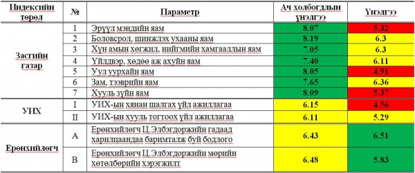 Засгийн газрын индексийг иргэд өмнөх судалгаанд 6.05 гэсэн индексээр үнэлж байсан бол энэ удаа тус үнэлгээ 0.22 функтаар буурч 5.83 болжээ. Индексийн үзүүлэлтийг бууруулахад Уул уурхай, Эрүүл мэнд, Хууль зүйн яамны үйл ажиллагаа нөлөөлсөн бол индексийг өсгөхөд Хүн амын хөгжил, нийгмийн хамгаалалтын яам, Зам тээврийн яам, Боловсрол шинжлэх ухааны ухааны яамны үйл ажиллагаа сайн байгаа нь үнэлгээнд нөлөөлсөн байна. Түүнчлэн яамдаас хамгийн өндөр үзүүлэлт буюу 6.36 гэсэн үнэлгээг иргэд Зам тээврийн яаманд өгчээ.
