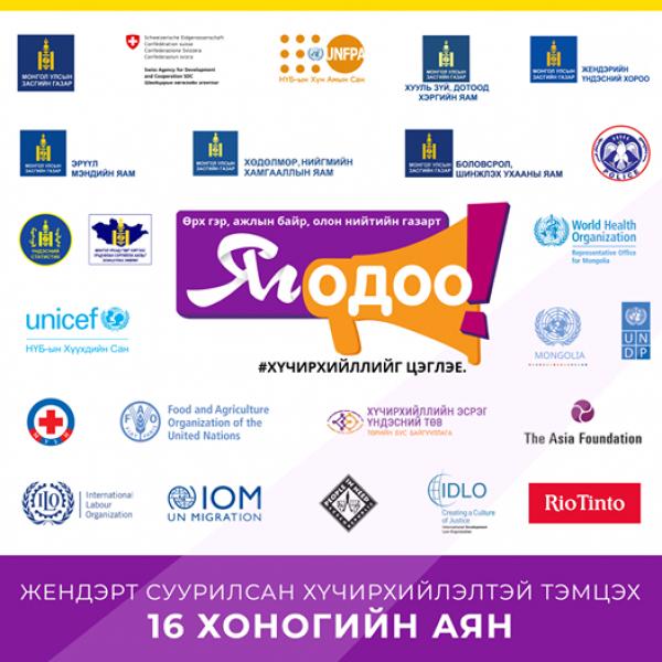 Энэ жил, НҮБ-ын төрөлжсөн байгууллагууд, элчин сайдын яамд, үндэсний болон олон улсын иргэний нийгмийн байгууллагууд, хувийн хэвшлийн компаниуд хамтран тус улсад гэр бүлийн хүчирхийлэл, олон нийтийн газар, ажлын байран дахь дарамт, хүний наймаа, хүүхэд, хөгшид, хөгжлийн бэрхшээлтэй иргэдийн эсрэг хүчирхийлэл зэрэг жендэрт суурилсан хүчирхийллийн бүх хэлбэрийг таслан зогсоохын төлөө ажиллахыг уриалж байна.