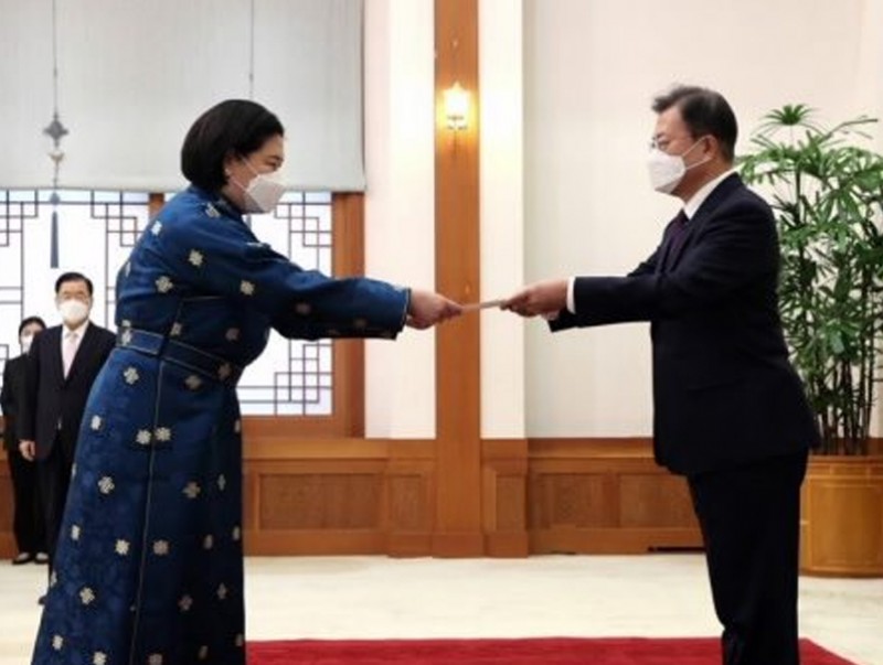 Монгол Улсаас БНСУ-д суух Онц бөгөөд Бүрэн Эрхт Элчин сайд Н.Эрдэнэтуяа 2021 оны хоёрдугаар сарын 17-ны өдөр БНСУ-ын Ерөнхийлөгч Мүн Жэ Ин-д Итгэмжлэх жуух бичгээ барив.
