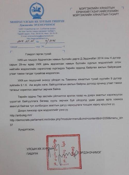 Тодруулбал, өнгөрсөн долоо хоногт УИХ дахь АН-ын бүлгийн хуралдааны мэдээллийг олон нийтэд хүргэх үеэр бүлгийн дарга Д.Эрдэнэбат өрөөндөө тамхи татдаг тухайгаа хэлсэн тул түүнд хариуцлага тооцохыг Мэргэжлийн хяналтын ерөнхий газраас хүссэн байна.