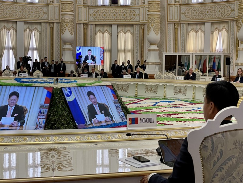 ШХАБ-ын ажиглагчийн статустай Монгол Улсын Ерөнхийлөгч У.Хүрэлсүх тус хуралдаанд цахимаар үг хэллээ. Тэрбээр Монгол Улс эдийн засаг, худалдаа, хөрөнгө оруулалт, хүмүүнлэгийн хамтын ажиллагаа, цөлжилттэй тэмцэх, элсний нүүдлээс хамгаалах, шар шороон шуурганы нөлөөг бууруулах чиглэлээр бүс нутгийн хэмжээнд нягт хамтран ажиллаж, холбогдох уулзалт, арга хэмжээг өөрийн орондоо хүлээн авч зохион байгуулахад бэлэн байгааг мэдэгдэв. Ерөнхийлөгч У.Хүрэлсүх Монгол Улс Ази, Европыг холбосон газар зүйн байршлын давуу талаа ашиглан худалдаа, тээвэр логистикийн сүлжээ, ачаа тээврийн урсгал, үйлчилгээний зангилаа болсон “Транзит Монгол Улс” болох зорилт тавьж байгааг мөн мэдэгдлээ.