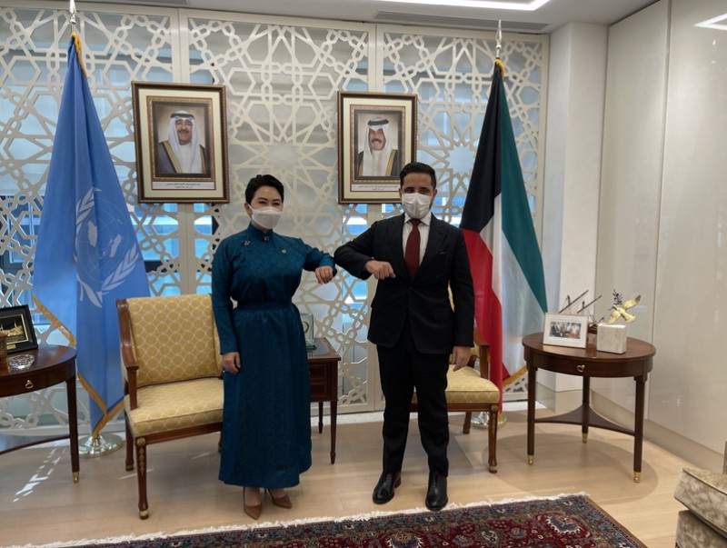 НҮБ-ын Ерөнхий Ассамблейн 76 дугаар чуулганы үеэр Монгол Улсын Гадаад харилцааны сайд Б.Батцэцэг Кувейт Улсын Гадаад хэргийн сайд Шейх Ахмад Нассер Аль-Мухаммад Аль-Сабахтай 2021 оны 9 дүгээр сарын 19-ний өдөр уулзав.