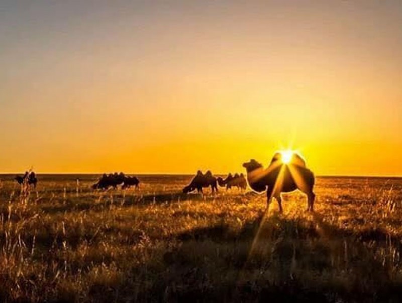 Говь нутагт эзэн суусан тэмээд өдийд газраар нэг навчин тамга дарж алхална. Тормолзсон бас мэлмэлзсэн алаг нүдэнд нь дэлхий унаж яваа нартайгаа хамт ганхан гунхана. Тэгсгээд нар хөлөө амраагаад алсын замдаа тэнгэрийн замаар өнхөрнө.