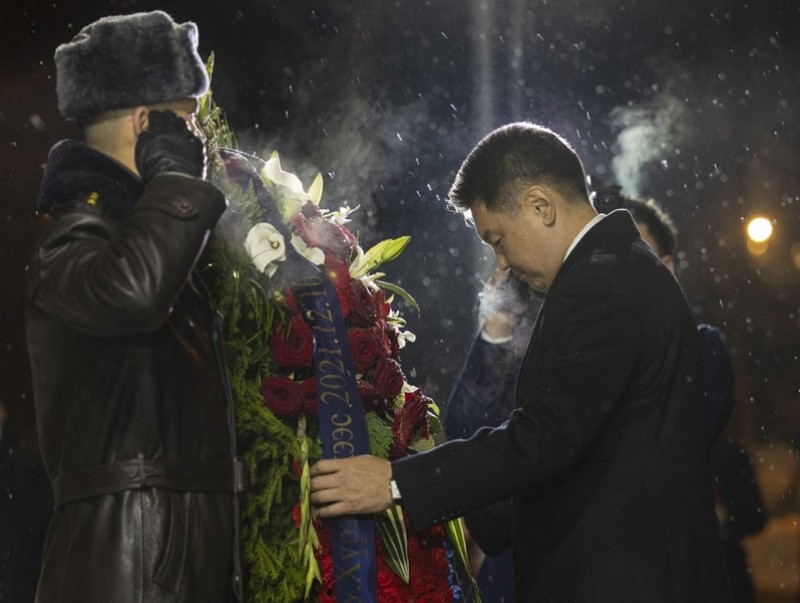 Оросын Холбооны Улсад албан ёсны айлчлал хийж байгаа Монгол Улсын Ерөнхийлөгч У.Хүрэлсүх Хүндэтгэлийн дэнж дэх Ялалтын цэцэрлэгт хүрээлэнд байрлуулсан “Ялалтад тэмүүлсэн морьд” хүрэл хөшөөнд цэцэг өргөж, хүндэтгэл үзүүлэв.