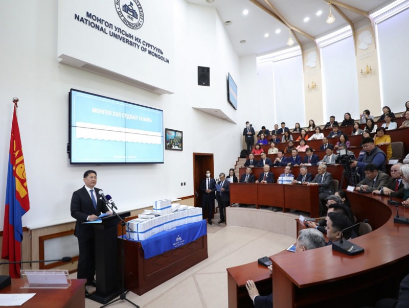 Монгол Улсын их сургууль, Монгол Улсын Боловсролын их сургууль, Шинжлэх ухааны академийн 40 гаруй эрдэмтний хамтран зохиосон “Монгол хэл судлал” 15 боть номын нээлт өнөөдөр Монгол Улсын их сургуулийн Эрдмийн танхимд боллоо. Монгол Улсын Ерөнхийлөгч Ухнаагийн Хүрэлсүх нээлтийн ёслолд оролцож үг хэллээ.