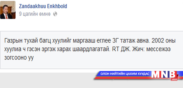 Сүүлийн өдрүүдэд Газрын тухай хуулийн төсөлтэй холбоотой маргаан нэлээдгүй гарч буй. Уг хуулийн төслийг газрыг эргэлтэд оруулах нэрийдлээр гадаадын иргэн болон аж ахуйн нэгжүүдийн мэдэлд шилжүүлэх гэж байна хэмээн сөрөг хүчин болон бие даагч гишүүд эсэргүүцэж байгаа. Үүнээс гадна иргэд ч гэсэн Газрын тухай хуулийн төслийг эсэргүүцэж, эргүүлэн татахыг шаардаж жагсаал хүртэл зохион байгуулсан. Тэр ч бүү хэл Газрын тухай хуулийн төсөлд нэр нь холбогдсон албан тушаалтнуудыг сүрдүүлж, элдэв мессеж бичих болсон. Энэ талаар өчигдөр УИХ-ын гишүүн Б.Гарамгайбаатар өөрийг нь дарамталж сүрдүүлсэн элдэв мессежүүд ирэх болсон талаар олон нийтэд мэдээлсэн.