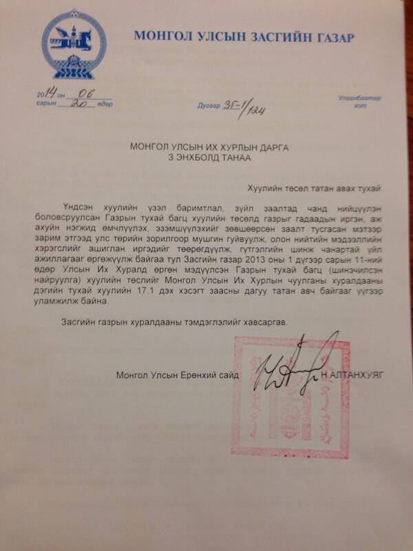 Ерөнхий сайдын УИХ-ын даргад хүргүүлсэн албан бичгийг бүрэн эхээр нь хүргэж байна.