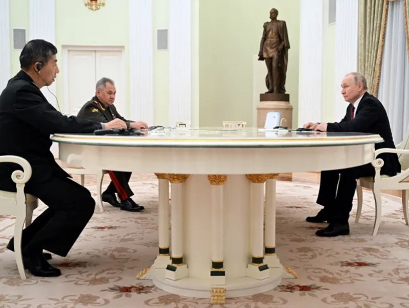 Хятадын дарга Ши Жиньпиний Москвад хийсэн хоёр өдрийн айлчлалаас хойш сар хүрэхгүй хугацааны дотор Путин болон оросын батлан хамгаалахын сайд Сергей Шойгу нар Хятадын батлан хамгаалахын сайд, генерал Ли Шанфуг хүлээн авч уулзаж байгаа нь энэ юм байна. Хятад улс Оросын Украинд явуулж байгаа цэрэг дайны ажиллагааг илтээр шүүмжилдэггүйн дээр АНУ болон НАТО-г Москваг өдөөн хатгасанд буруутгадаг. Гэхдээ Хятад улс Орост зэвсгээр туслахгүй гэдгийг хятадын Гадаад хэргийн яам өнгөрсөн 7 хоногт мэдэгдсэн. АНУ болон түүний холбоотнууд үүнээс ихээхэн болгоомжилж байсан. Украины хямралд Хятад улс албан ёсоор төвийг сахисан байр суурь баримталсан хэвээрээ. Гэхдээ Ши Жиньпиний Орост хийсэн айлчлал, Украины дайны нөхцөлд Орост эдийн засгаар тусалж, улс төрийн халхавч болж өгч байгаа гэдгээрээ харилцаанд давамгайлах байр сууриа баталсан хэрэг болсон гэж ажиглагчид мөн дүгнэдэг. Путин Хятадын сайдыг хүлээн авч уулзах үеэрээ, орос-хятадын харилцааны ерөнхий хөгжлийг өндрөөр үнэлж, “батлан хамгаалах яамд хоорондоо идэвхтэй хамтран ажиллаж, чухал мэдээллүүд солилцож, цэрэг-техникийн салбарт хамтрахын зэрэгцээ, Алс Дорнод, Европын бүсэд болон ус, агаар, хуурай газарт гээд олон талбарт хамтарсан цэргийн сургуулилалт явуулж байна” гэж ярьжээ.