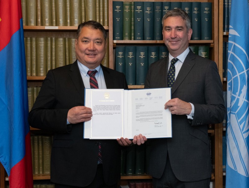 Олон улсын иргэний нисэхийн тухай конвенцын 50 дугаар зүйлийн а) хэсэг, 56 дугаар зүйлд нэмэлт, өөрчлөлт оруулах тухай протоколуудыг Монгол Улс соёрхон баталсан тухай Батламж жуух бичгийг ОУИНБ-ын дэргэд суугаа Байнгын төлөөлөгч, Элчин сайд Я.Ариунболд 2023 оны зургаадугаар сарын 27-ны өдөр ОУИНБ-д хадгалуулав. Батламж жуух бичиг хадгалуулах үйл ажиллагаанд ОУИНБ-ын Эрх зүйн газрын захирал Майкл Гилл байлцлаа.