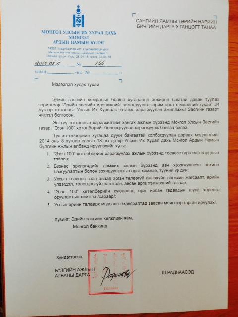 | “Эзэн-100” хөтөлбөрийн биелэлтийн талаар мэдээлэл авахыг хүслээ | ||