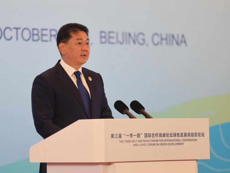 БНХАУ-ын Бээжин хотноо “Бүс ба Зам” олон улсын хамтын ажиллагааны дээд түвшний гурав дахь удаагийн чуулга уулзалтад оролцож буй Монгол Улсын Ерөнхийлөгч Ухнаагийн Хүрэлсүх 2023 оны аравдугаар сарын 18-ны өдөр чуулга уулзалтын “Ногоон Торгоны замыг хамтдаа бүтээж, хүн ба байгалийн эв зохистой оршихуйг урагшлуулъя” хэлэлцүүлэгт оролцож, үг хэллээ.