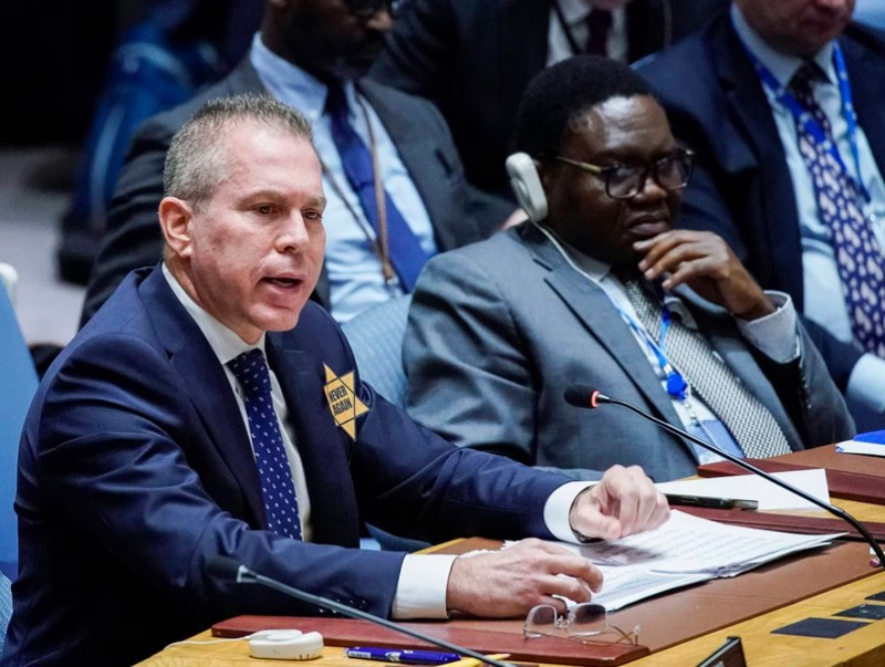 Гилад Эрдан НҮБ дахь Израил улсын байнгын төлөөлөгч “Миний өвөг эцэг, түүний өвөг эцэг, тэдэнтэй мөр зэрэгцсэн сая сая еврей иргэний нэгэн адилаар одооноос эхлэн би болон манай багийнхан энэ шар одыг зүүж энэ хуралд оролцох болно. Та бүхэн Хамас бүлгийн хийсэн гэм бурууг шүүж, зохих арга хэмжээг авах хүртэл, барьцаанд байгаа иргэдийг суллуулах хүртэл энэ одыг тайлахгүй. Энэ од бол Израилын ард түмний бахархлын тэмдэг. Ард түмнээ хамгаалах ёстой гэсэн сануулга болгож байна” хэмээн ярилаа.