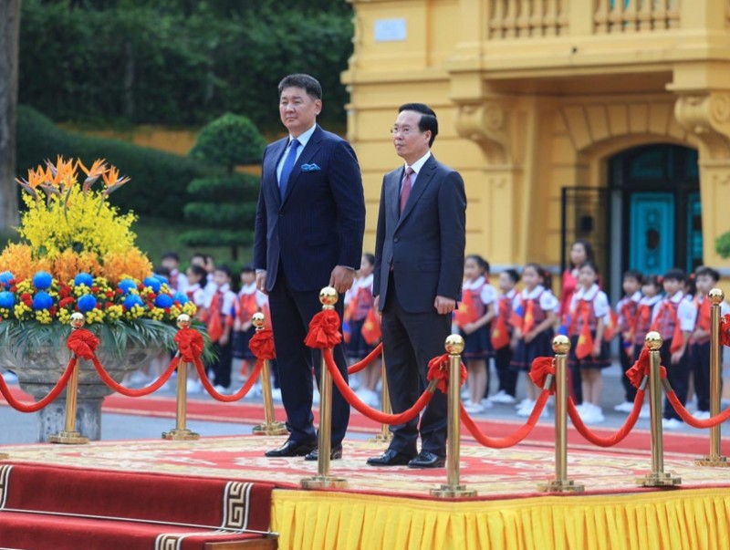 Монгол Улсын Ерөнхийлөгч Ухнаагийн Хүрэлсүх, гэргий Лувсандоржийн Болорцэцэг нарыг Бүгд Найрамдах Социалист Вьетнам Улсын Ерөнхийлөгч Во Ванг Тыөнг гэргий Фан Тхи Дамын хамт Ерөнхийлөгчийн ордны өмнө албан ёсоор угтлаа.