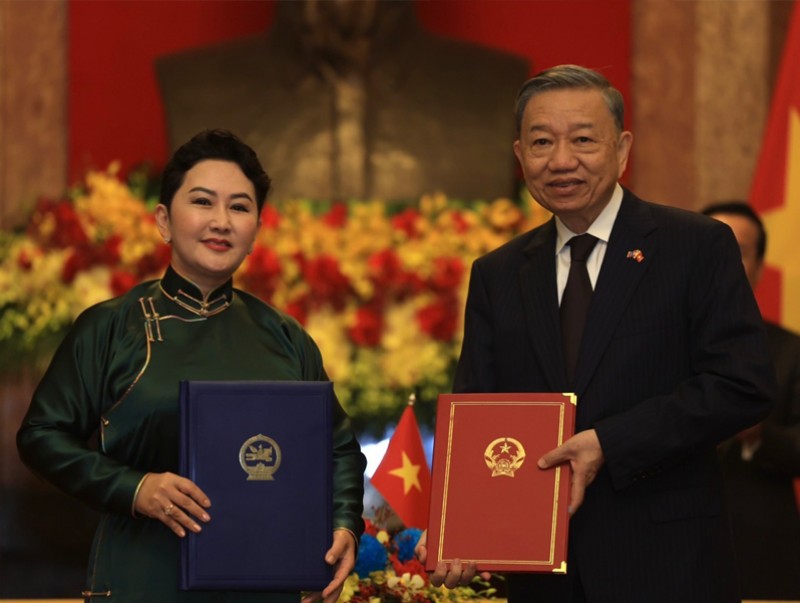 Монгол Улсын Ерөнхийлөгчийн Бүгд Найрамдах Социалист Вьетнам Улсад хийж буй төрийн айлчлалын хүрээнд Монгол Улсын Ерөнхийлөгч Ухнаагийн Хүрэлсүх, БНСВУ-ын Ерөнхийлөгч Во Ван Тыөнг нарыг байлцуулан хоёр улсын харилцаа, хамтын ажиллагааны баримт бичигт гарын үсэг зурах ёслол боллоо.