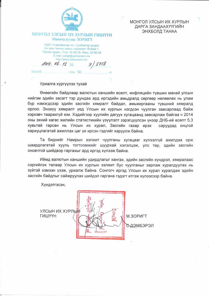 Харин энэ удаад УИХ-ын гишүүн М.Зоригт, С.Дэмбэрэл нар УИХ-ын чуулганыг яаралтай хуралдаж эдийн засгийн байдлыг сайжруулах шийдвэр гаргахыг шаарджээ. Гишүүд өнөөдөр УИХ-ын дарга З.Энхболдод дараах уриалгыг хүргүүлсэн байна.
