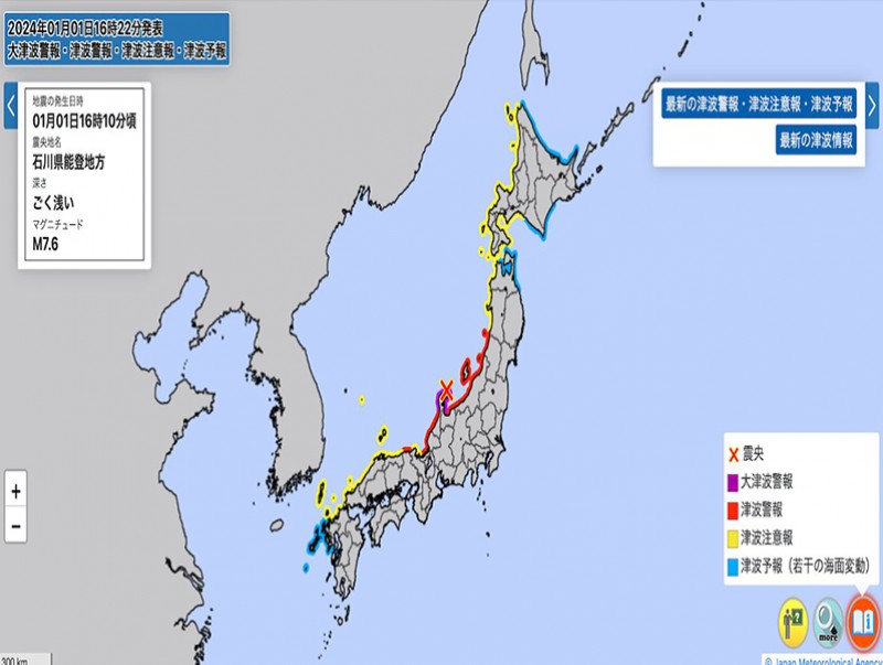 Тус улсын цаг уурын хүрээлэн баруун эргийн бүс нутгууд буюу Ишикава, Нийгата, Тояама мужуудад цүнамигийн түгшүүр зарлажээ.