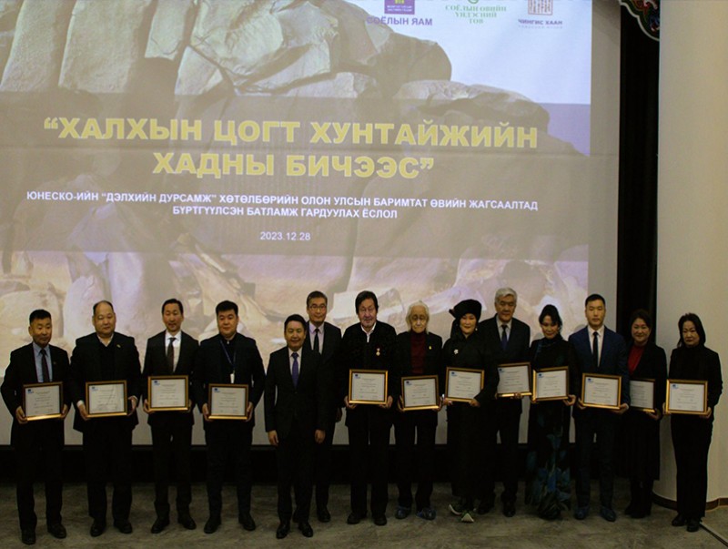 “Халхын Цогт хунтайжийн хадны бичээс” (Stone Inscriptions of Tsogtu Khung-Taiji, Prince of Khalkha)-ийг ЮНЕСКО “Дэлхийн дурсамж” хөтөлбөрийн олон улсын баримтат өвийн жагсаалтад бүртгэсэн батламж гардуулах ёслол “Чингис хаан” үндэсний музейд боллоо. Бүгд Найрамдах Франц Улсын нийслэл Парис хотноо 2023 оны 5 дугаар сард хуралдсан ЮНЕСКО н "Дэлхийн дурсамж" хөтөлбөрийн олон улсын зөвлөлдөх хорооны хурлаар гишүүн орнуудаас нэр дэвшүүлсэн баримтат өвийн материалыг судлан хэлэлцэж, 64 хосгүй үнэт дурсгалыг тус хөтөлбөрийн олон улсын баримтат өвийн жагсаалтад бүртгэсний дотор Монгол Улсаас нэр дэвшүүлсэн “Халхын Цогт хунтайжийн хадны бичээс” өв багтсан юм. ЮНЕСКО "Дэлхийн дурсамж" хөтөлбөрт бүртгэсэн батламжийг Соёлын дэд сайд М.Батбаяр Халхын Цогт хунтайжийн хадны бичээсийг ЮНЕСКО-д бүртгүүлэхэд онцгой үүрэгтэй ажилласан болон цаашид эл дурсгалыг хадгалж хамгаалах, судлах, сурвалжлах, сурталчлах, сэргээн засварлах үүрэг бүхий төрийн болон төрийн бус байгууллага, хувь хүмүүсийн төлөөлөлд гардуулан өгөв. Батламж гардуулах ёслолд Монгол Улсын Үндэсний номын сан, Монголын Үндэсний музей, “Чингис хаан” үндэсний музей, Архивын Ерөнхий газар, Монгол Улсын Ерөнхийлөгчийн дэргэдэх Хэлний бодлогын үндэсний зөвлөл, Соёлын гавьяат зүтгэлтэн, зохиолч, сэтгүүлч, судлаач, дуун хөрвүүлэгч Го.Аким, Төв аймгийн Засаг даргын Тамгын газар ба Соёл, урлагийн газар, музей, Төв аймгийн Дэлгэрхаан сумын Засаг даргын Тамгын газар, Нутгийн зөвлөлийн төлөөлөл хүрэлцэн ирж, ЮНЕСКО- “Дэлхийн дурсамж” хөтөлбөрийн батламжийг гардан авлаа. Монгол Улсын Засгийн газраас ирэх 2024 оны Үндэсний бичиг соёлын жил болгон зарлаж, Монгол бичгийн хамгийн эртний дурсгал болох Чингисийн чулууны бичиг нэрээр алдартай Есүнхэ мэргэний гэрэлт хөшөөний 800 жил, Халхын Цогт хунтайжийн хадны бичээсний 400 жилийн ойг тэмдэглэхээр тогтоод байгаа билээ.