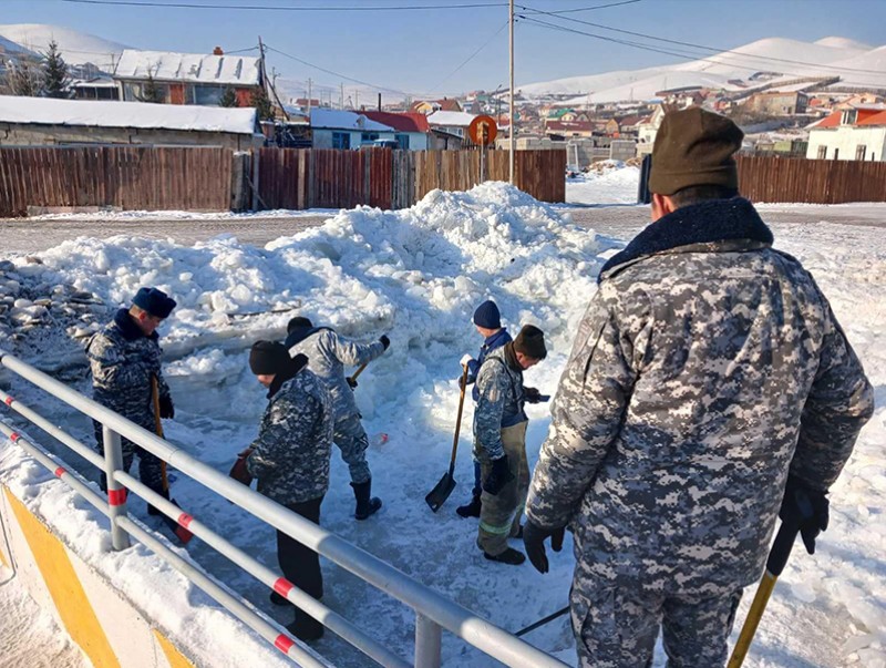 Чингэлтэй дүүргийн 11 дүгээр хорооны гуравдугаар сувагт халиа дошин үүссэнийг тухайн хэсэгт Геодези, Усны Барилга Байгууламжийн Газрын ажилтнууд үүрэг ажиллаж, авто замын орц гарцын доорх мөсийг механизм болон гар ажиллагаагаар 1.6х1.2х280 урт метр суваг татаж, 18 удаа 280 тонн мөсийг ачуулан айл, авто замын зорчих хэсэг рүү ус хальж орохоос сэргийлжээ.