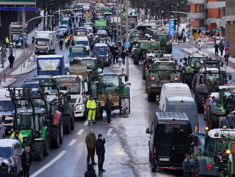 Өнгөрсөн долоо хоногт эхэлсэн Герман улсын фермерүүдийн трактортой бослого өнөө өглөөний байдлаар Берлин хотыг бүх талаас нь бүсэлж, Берлиний Бранденбургийн хаалга орчмын гудамж талбайг дүүргээд байна. Ойролцоогоор 3000 трактор, 2000 орчим том оврын ачааны машин, 10 мянга орчим хүний бүрэлдэхүүнтэй жагсаал өрнөж байна. Германы фермерүүд канцлер Олаф Шольцийн эвслийн засгийн газрын өргөн барьсан шинэ төсвийн төслийг эсэргүүцэж ийнхүү жагсаж байгаа юм.