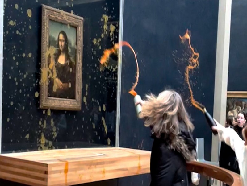 Ням гарагт уур амьсгалын өөрчлөлттэй тэмцэгч хоёр бүсгүй Франц дахь “Мона Лиза” бүтээл рүү хулууны шөл цацжээ. Зургийг шилэн хаалтаар хамгаалсан байсан тул ямар нэг гэмтэл үүсээгүй гэв. Шөл цацсан эмэгтэйчүүд “Аль нь илүү чухал вэ? Урлагийн бүтээл үү эсвэл эрүүл, байгальд ээлтэй хоол хүнс идэх эрх үү?” гэсэн нь бичлэгт үлджээ.