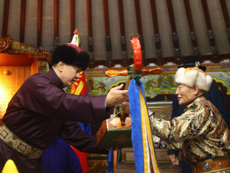 | Ерөнхийлөгч У.Хүрэлсүх Есөн хөлт цагаан туганд хүндэтгэл үзүүлж, Төрийн золголт хийв | ||